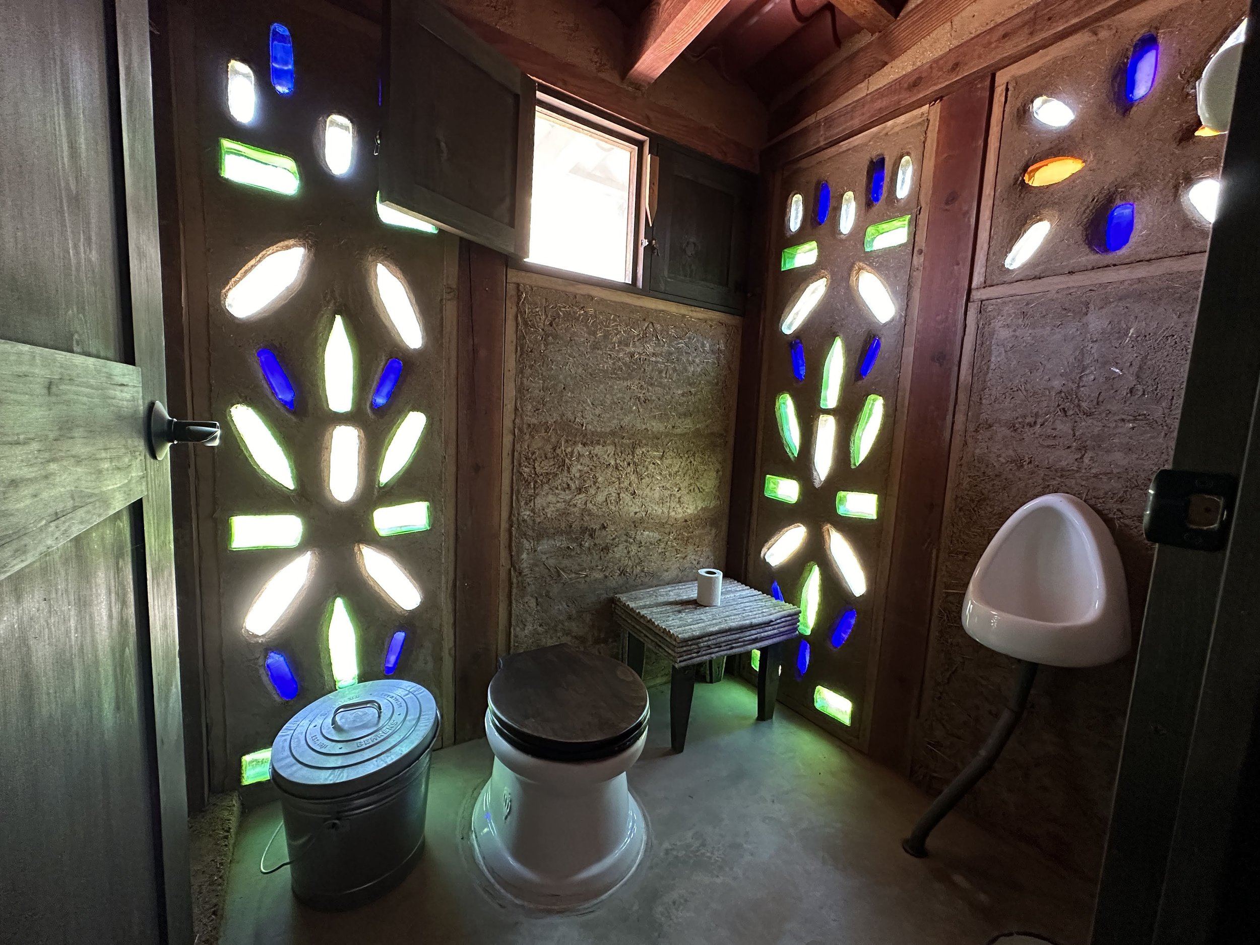 We enter a room whose adobe walls glow with light streaming through recycled, colored glass bottles that have been incorporated into the exterior walls’ design. Against the far wall is a toilet. Next to the toilet stands a metal bucket holding dried, herbaceous-smelling straw.